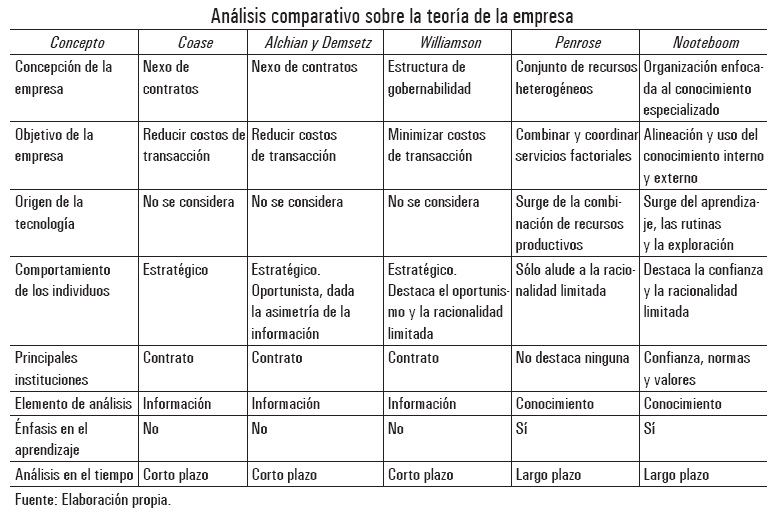 En este trabajo se presentaron tres propuestas con este corte: la de Coase, la de Alchian y Demsetz y la de Williamson. Las mismas surgieron tratando de responder distintas preguntas en torno a la firma, aunque coinciden de forma importante en tanto que en su análisis destacan los siguientes elementos: los costos de transacción, los contratos y la falta de información como elemento que genera incertidumbre cuando se toman decisiones (véase el cuadro).
